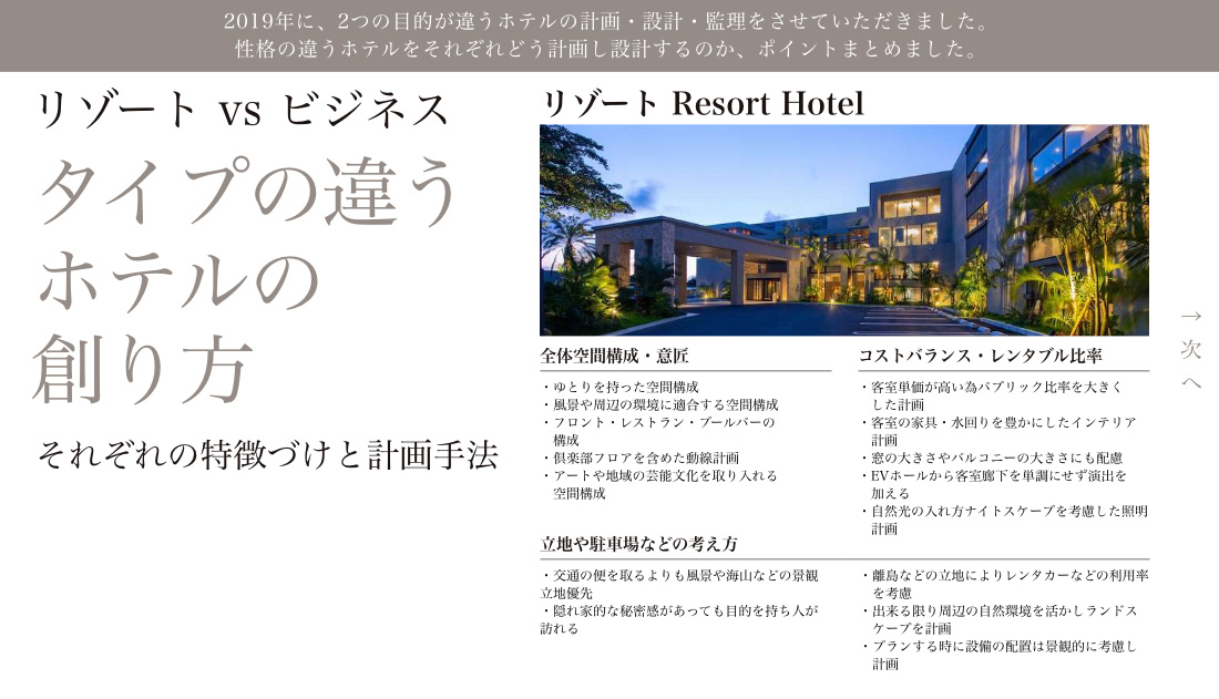 ホテル設計・アトリウム・ロビーやパブリックエリアの設計、リゾート施設のマスタープランは海外からの依頼もあります。